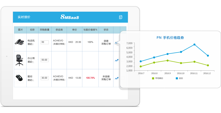 3、8MSaaS SPM記錄每個(ge) 產(chan) 品全部曆史交易價(jia) 格,並能設定規則來形成產(chan) 品基準價(jia) , PR及PO偏離基準價(jia) 時,係統會(hui) 亮紅預警決(jue) 策層。