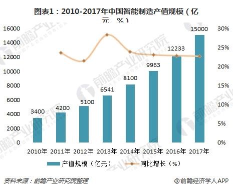 根據前瞻產(chan) 業(ye) 研究院數據資料顯示,2010-2017年,我國智能製造行業(ye) 保持著較為(wei) 快速的增長速度,到2017年,我國智能製造行業(ye) 的產(chan) 值規模已達到15000億(yi) 元左右。預計未來幾年我國智能製造行業(ye) 將保持11%左右的年均複合增速,到2023年行業(ye) 市場規模將達到2.81萬(wan) 億(yi) 元,行業(ye) 增長空間巨大。