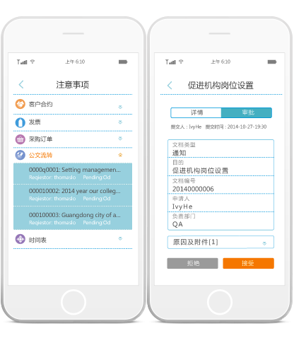 移動式與(yu) 手機APP訪問,讓審批不再局限於(yu) PC端和辦公室,讓許多跨地辦公的人員可通過手機端訪問係統進行日常審批工作。