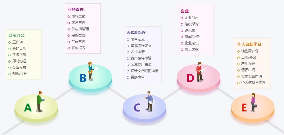 OA係統的基本功能是作為(wei) 企業(ye) 各部門協作與(yu) 溝通的平台,作為(wei) 動態信息展示窗口,通過各種信息化的溝通工具,如即時消息、郵件、協同工作、論壇、通知、公告等,幫助企業(ye) 管理者和員工之間進行及時的溝通和協作。並通過將紙質的審批單據電子化和模版化、將人工審批流程、業(ye) 務辦理流程自動化,避免大量的流程堆積,優(you) 化企業(ye) 審批流程,全麵提升辦公效率。