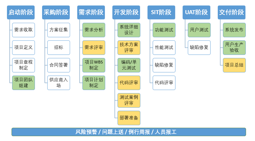 首先需要清楚了解IT項目的管理的七大階段,包括啟動、采購、需求、開發、SIT階段、UAT階段以及交付階段。在七個(ge) 階段中,項目經理需要明晰每個(ge) 階段所要做的事情,實時監控項目的執行過程,隨時應對項目風險預警。