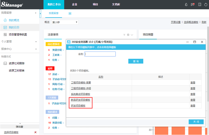 可根據係統提供的研發項目模板輕鬆創建項目,從(cong) 項目啟動、計劃、實施、控製到收尾等過程進行項目的需求、計劃、執行、變更、資源、工時/成本/質量控製、評審與(yu) 驗收等管理,在一個(ge) 頁麵即可查看和管理所有的項目活動。