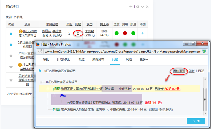 在項目實施過程最怕遇到問題及風險,在qmchashi係統信息共享機製的支持下,可以實時查看項目執行計劃,動態監控項目進度。對於(yu) 項目執行過程中出現的問題,係統的問題地圖實時匯總並按優(you) 先等級羅列,幫助及時解決(jue) 問題,降低項目風險。項目經理和成員在工作台即可進行問題/風險管理,發現問題/風險後指派負責人及時處理。