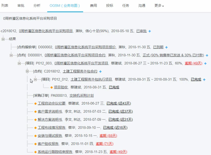 下麵通過一個(ge) 交付型項目的業(ye) 務地圖,來看看qmchashi係統的全流程執行過程:從(cong) 售前立項階段開始,經過售前跟進及報價(jia) 後,與(yu) 加拿大pc网页版官网成功簽訂合同,可以看到合同當前的回款情況、合同的執行情況、項目的負責人、周期、當前完工率及進度狀態等。通過項目的執行情況,可以展開查看裏程碑進度,包括項目的采購訂單、外包合同、甚至包括外包項目的進度跟進,十分高效便捷。