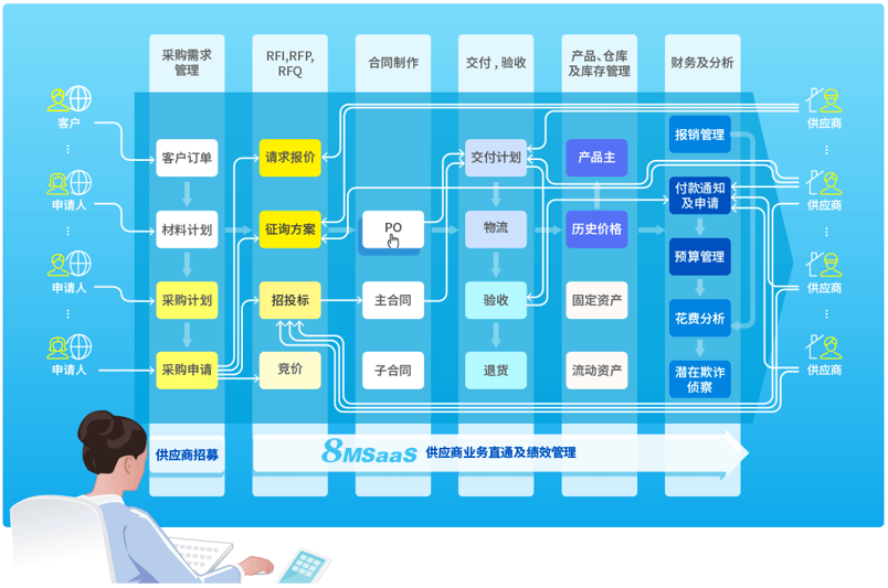 采購流程包括從(cong) 采購申請/計劃、訂單、合同、產(chan) 品交付與(yu) 驗收、收貨/庫存及退貨等方麵,采購進度實時掌控,實現全電子化管理,有效解決(jue) 非標采購流程長、手續繁瑣、效率低的問題。針對企業(ye) 多部門間的割裂問題,8MSaaS采用業(ye) 務直通式模式,實時連通企業(ye) 多方業(ye) 務數據,保證跨部門的協作與(yu) 溝通,極速提升供應商管理和采購效率!