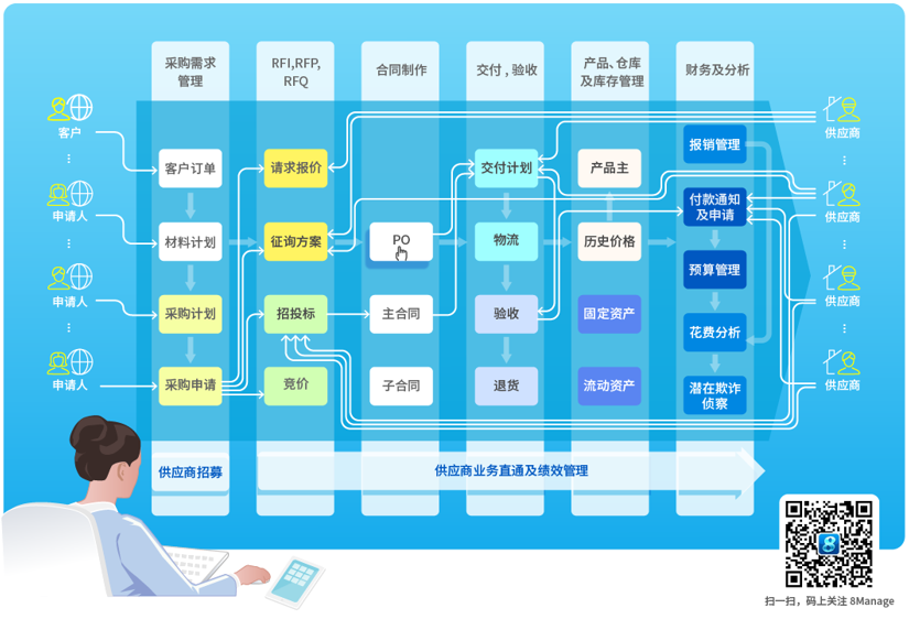 8MSaaS SPM支持采購雲(yun) 端全麵信息化,通過采購申請與(yu) 審批流程、采購定價(jia) (詢比價(jia) ,競價(jia) ,協議價(jia) )、一站式采購訂單管理、發貨,收貨,驗收入庫等管理,實現對采購科學、透明化的管理。並與(yu) 項目、財務信息實時互聯,從(cong) 供應、倉(cang) 儲(chu) 、財務,到生產(chan) 、銷售、運輸,雲(yun) 端即時監控,全麵一體(ti) 化管理,消滅采購灰色地帶。