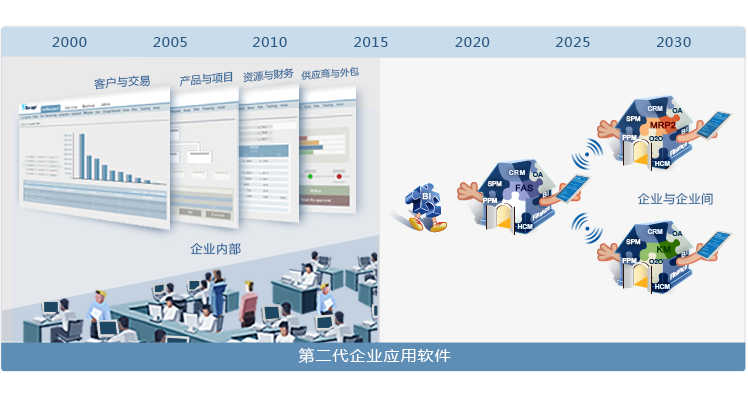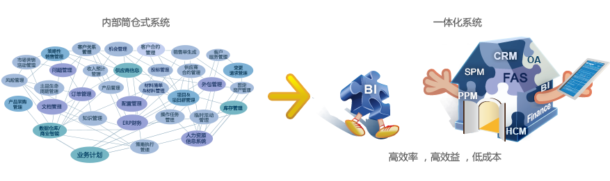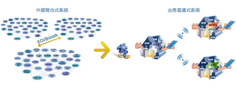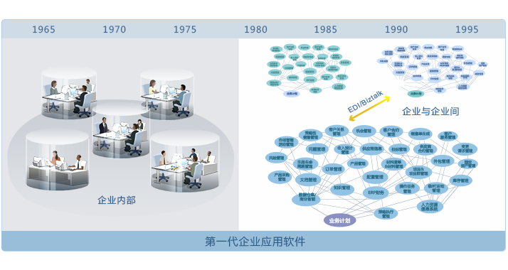 1970年代至1990年代,應用軟件科技遠未成熟,企業(ye) 別無選擇,隻能購買(mai) 多個(ge) 分散的係統來實現企業(ye) 核心業(ye) 務流程的自動化。用分散的係統來實現自動化是十分昂貴的,而更大的問題在於(yu) 這些數據是在不同的係統手動錄入或更改,極大地影響了數據的連貫性、準確性與(yu) 及時性,令一體(ti) 化管理無法實現。