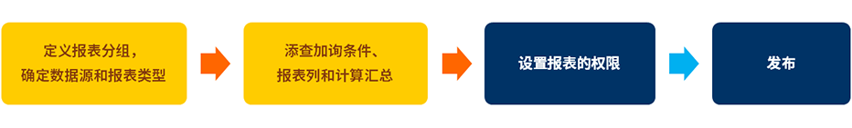 如何生成示例報表:(1)選擇報表對象和報表類型 (2)輸入報表名稱(3)選擇顯示列(4)選擇查詢條件(5)添加計算匯總(6)保存(7)點擊發布生成報表